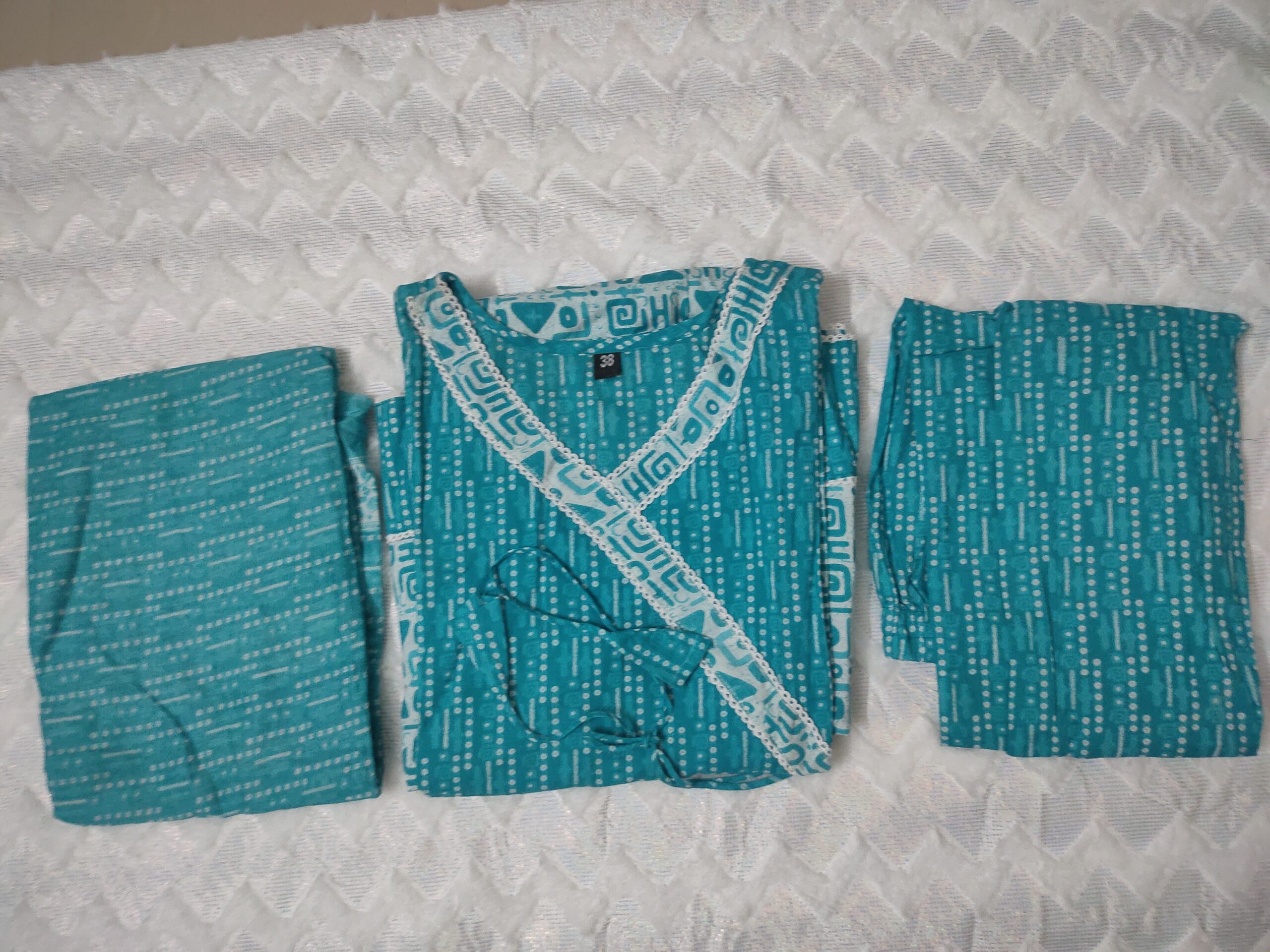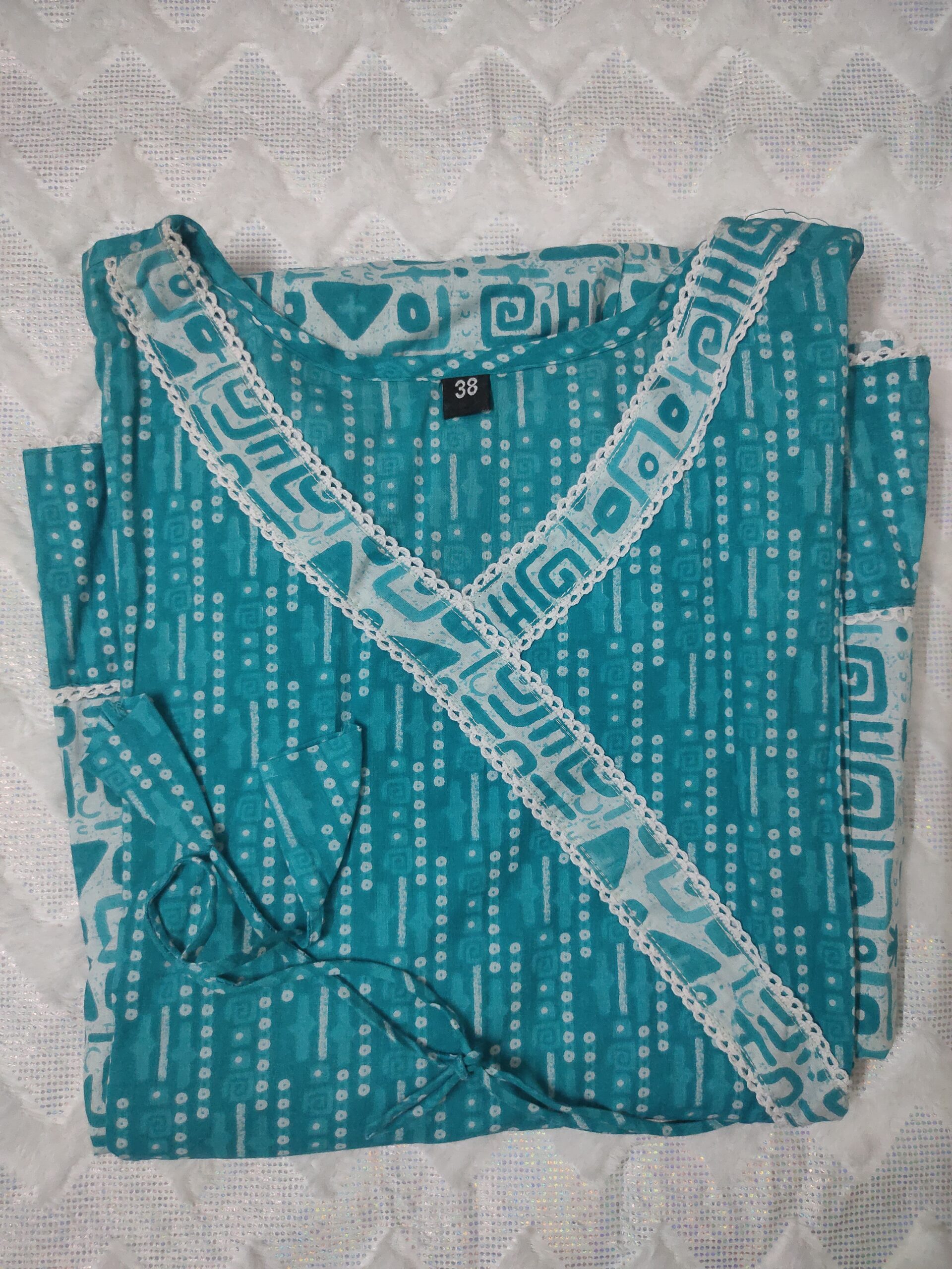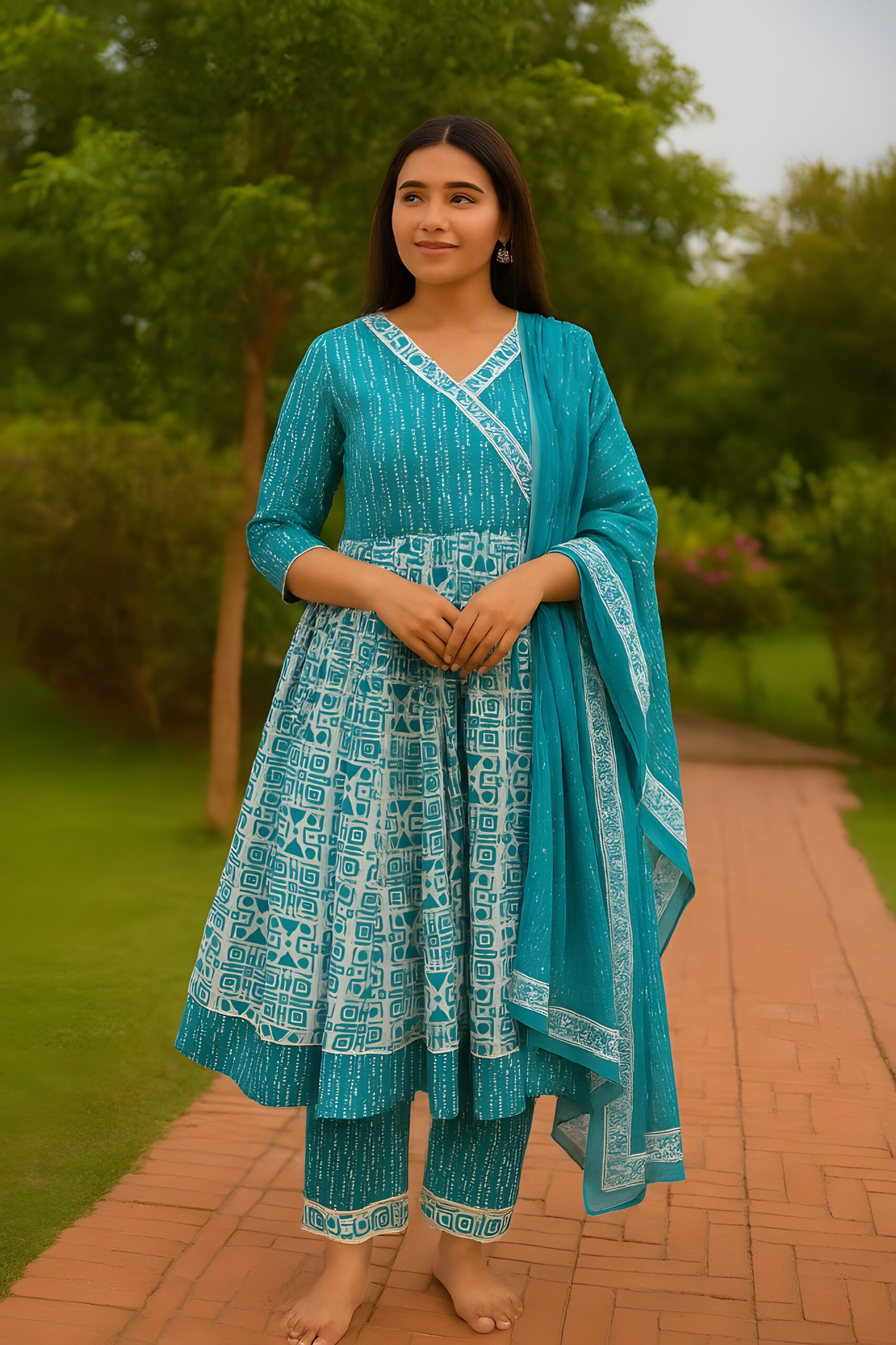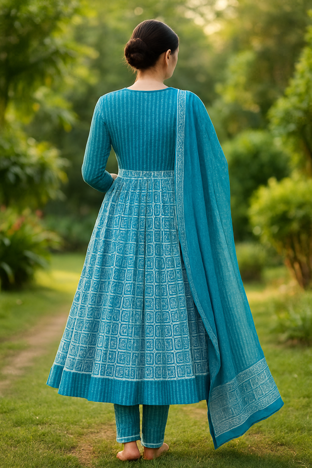 Refresh your ethnic wardrobe with this aqua blue Anarkali kurta set, designed with a graceful flared silhouette and intricate hand-block inspired prints. The V-neckline with contrast border detailing adds an elegant finish, while the straight pants and matching dupatta complete the ensemble. Ideal for festive occasions, casual gatherings, or summer celebrations, this set combines comfort with timeless beauty.