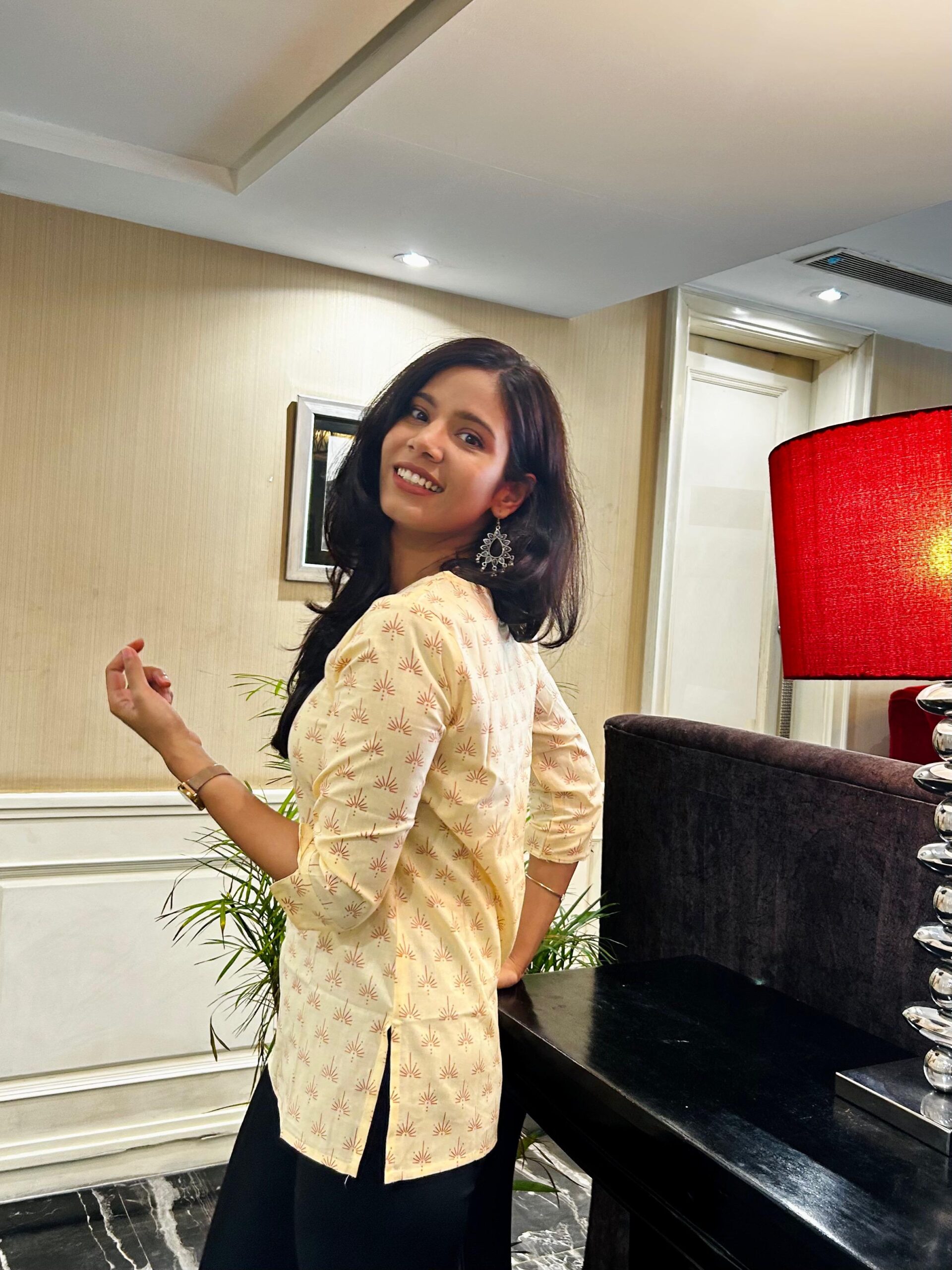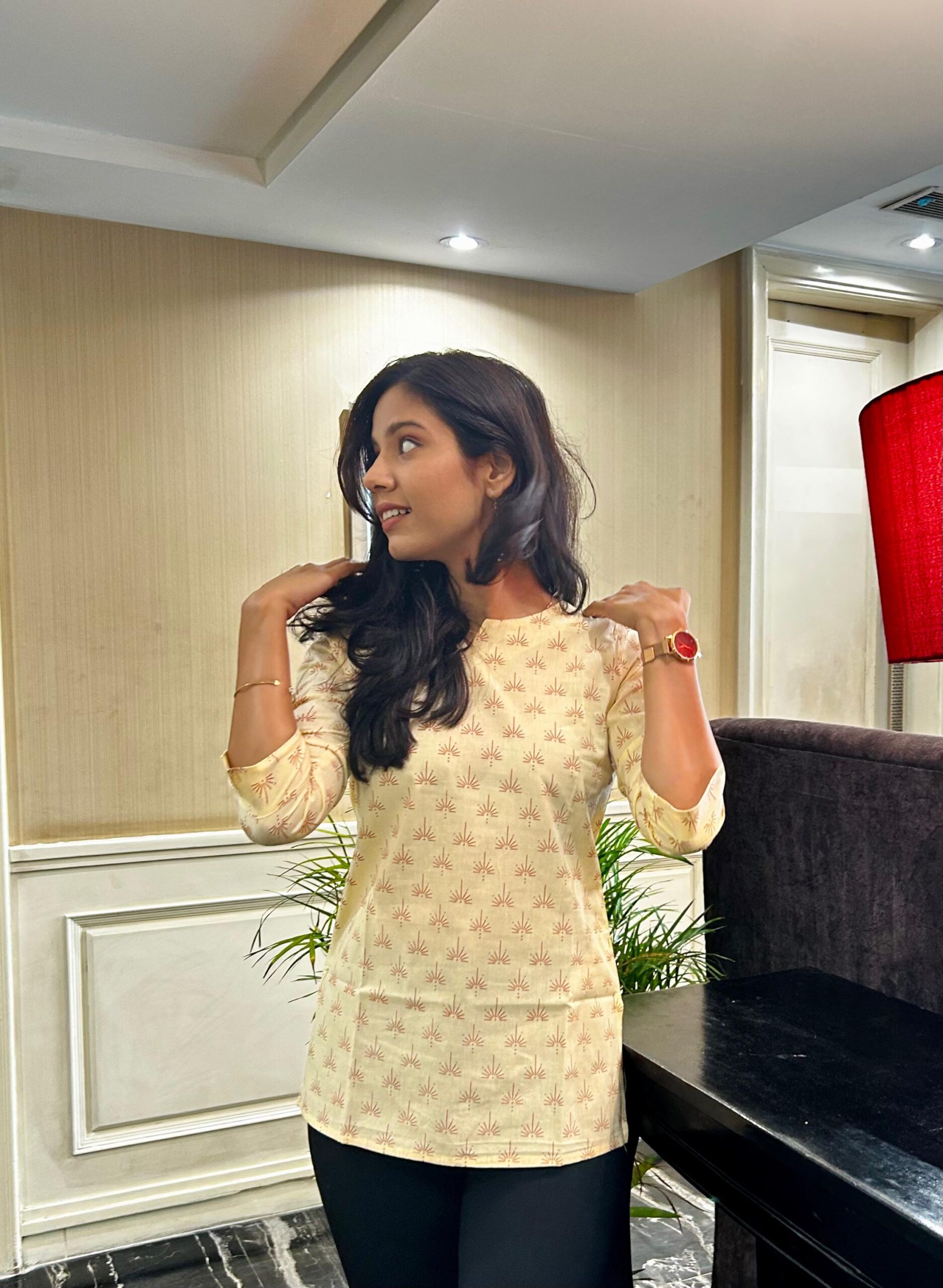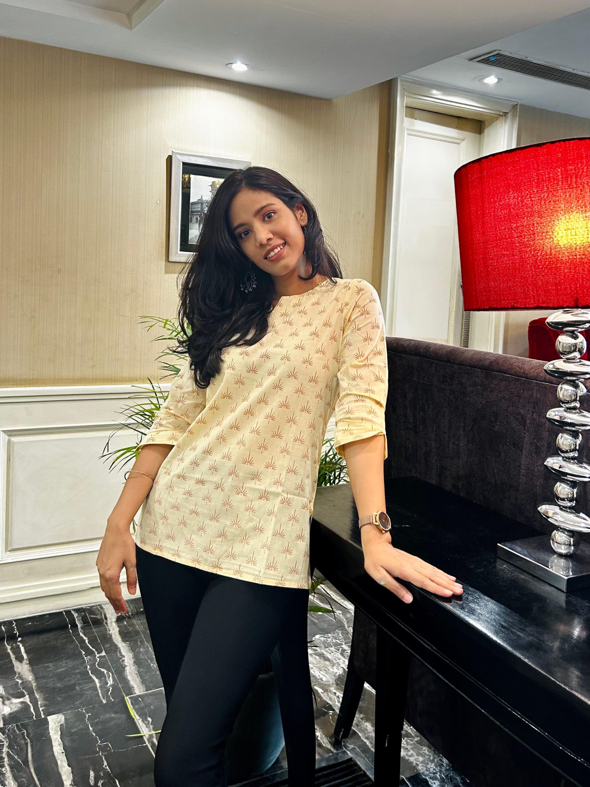 This beige straight kurta with delicate all-over prints is the perfect blend of comfort and elegance. Designed with a round neckline and 3/4th sleeves, it offers a graceful yet simple look suitable for daily wear, office wear, or casual outings. Crafted from soft breathable fabric, it ensures day-long ease while keeping you stylish. Pair it with leggings, pants, or palazzos to create multiple versatile looks.