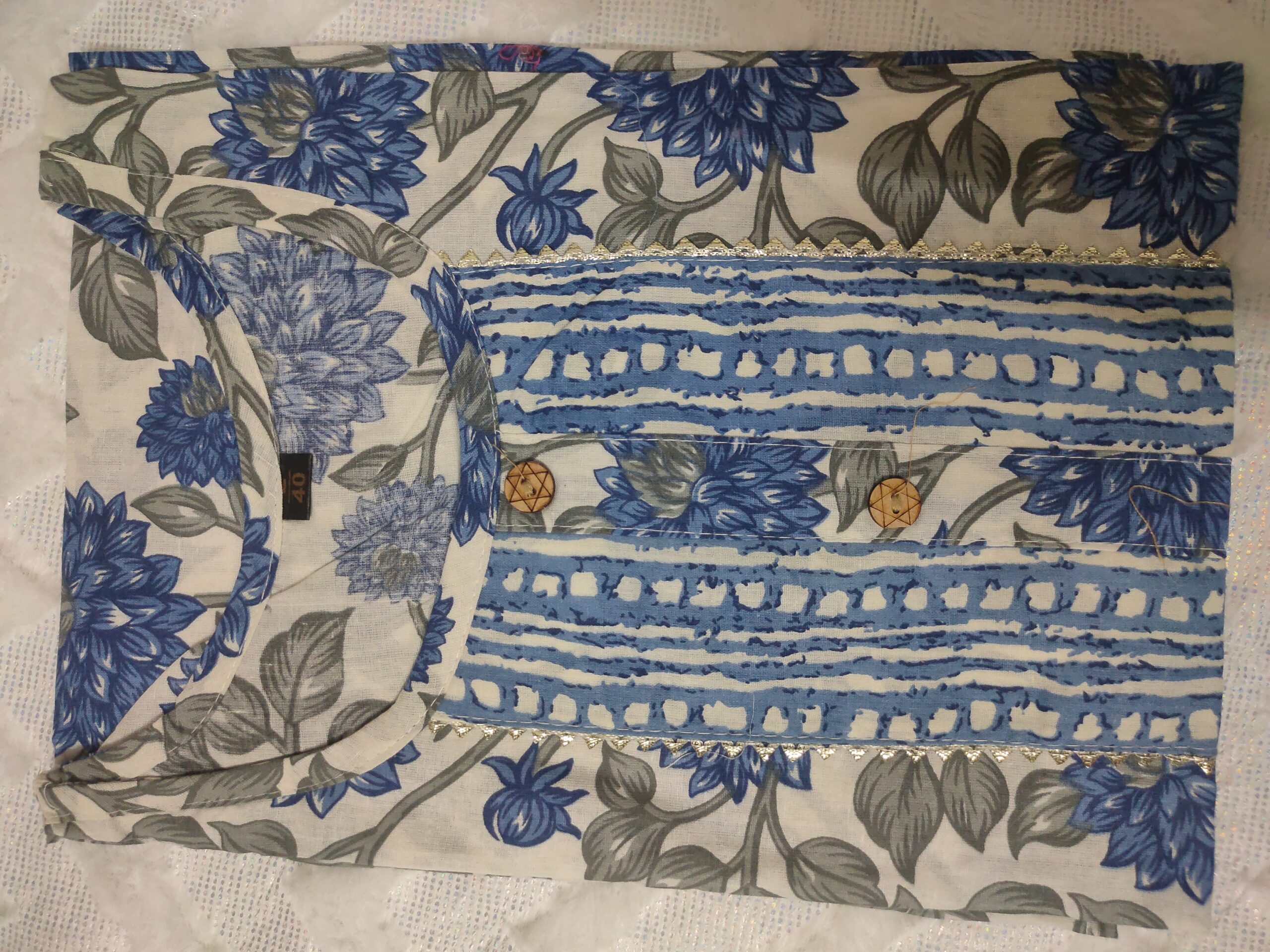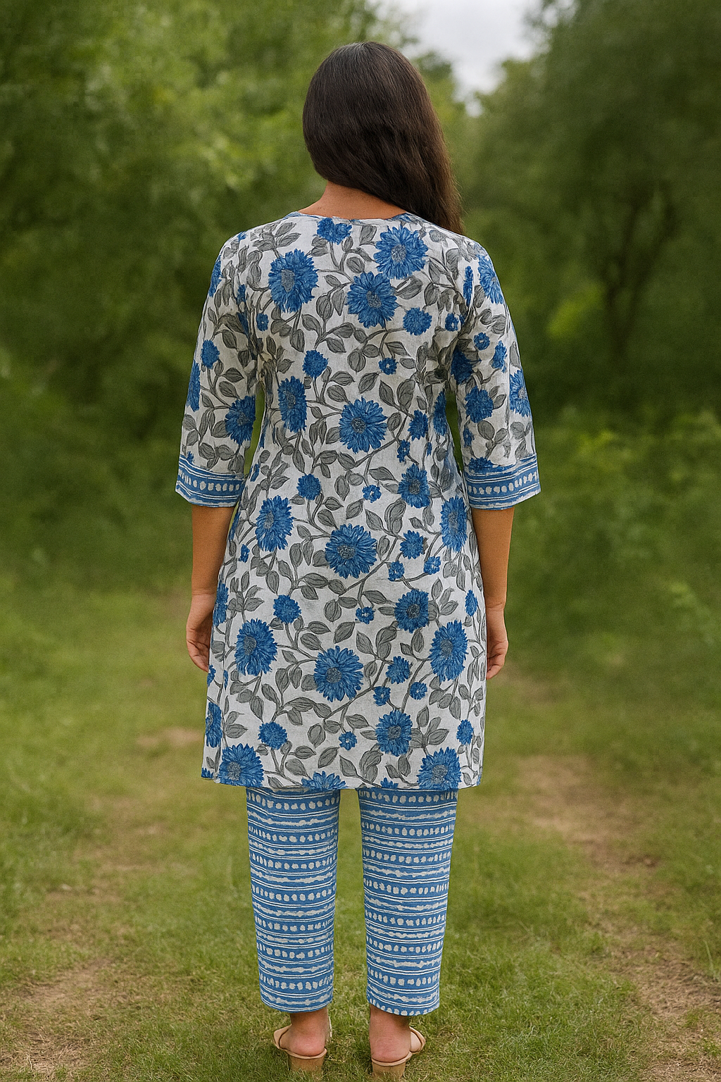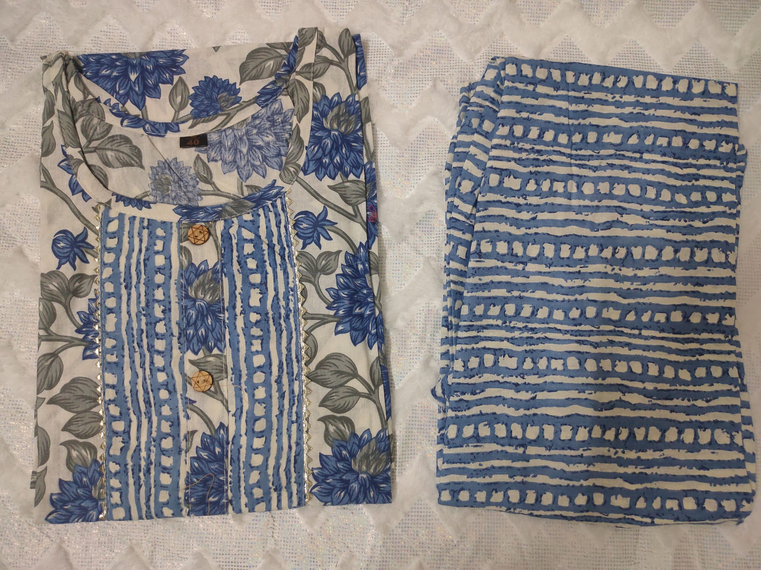 Bring freshness to your wardrobe with this blue and white floral printed cotton kurta set. The kurta features a round neckline with button detailing, 3/4th sleeves, and a straight cut that offers a flattering fit. Paired with contrasting striped pants, this set blends traditional charm with a modern touch. Perfect for everyday wear, office, or casual outings, its breathable cotton fabric ensures comfort all day long.