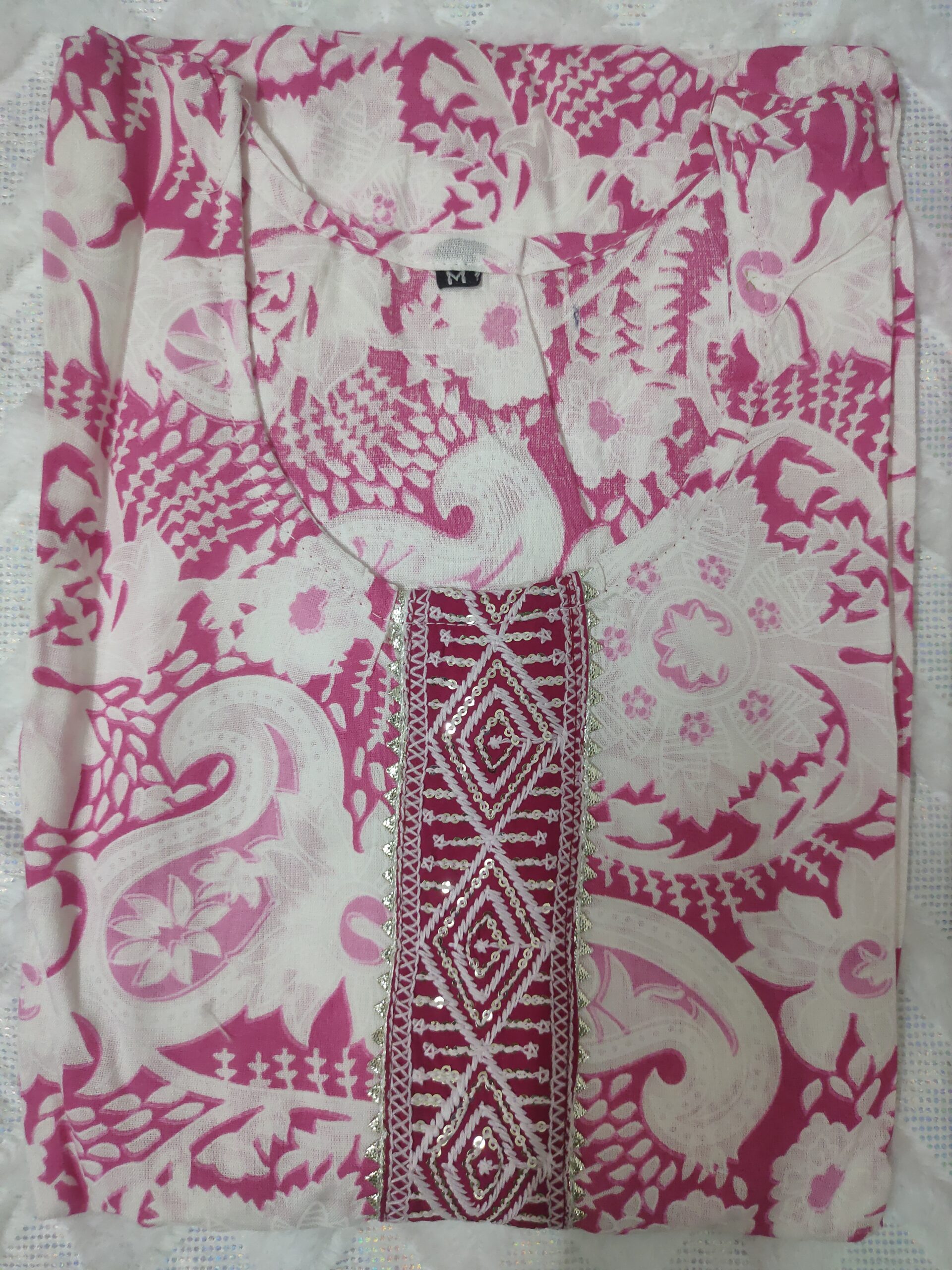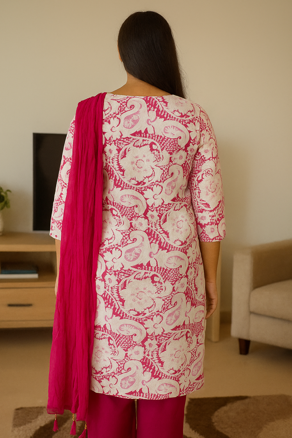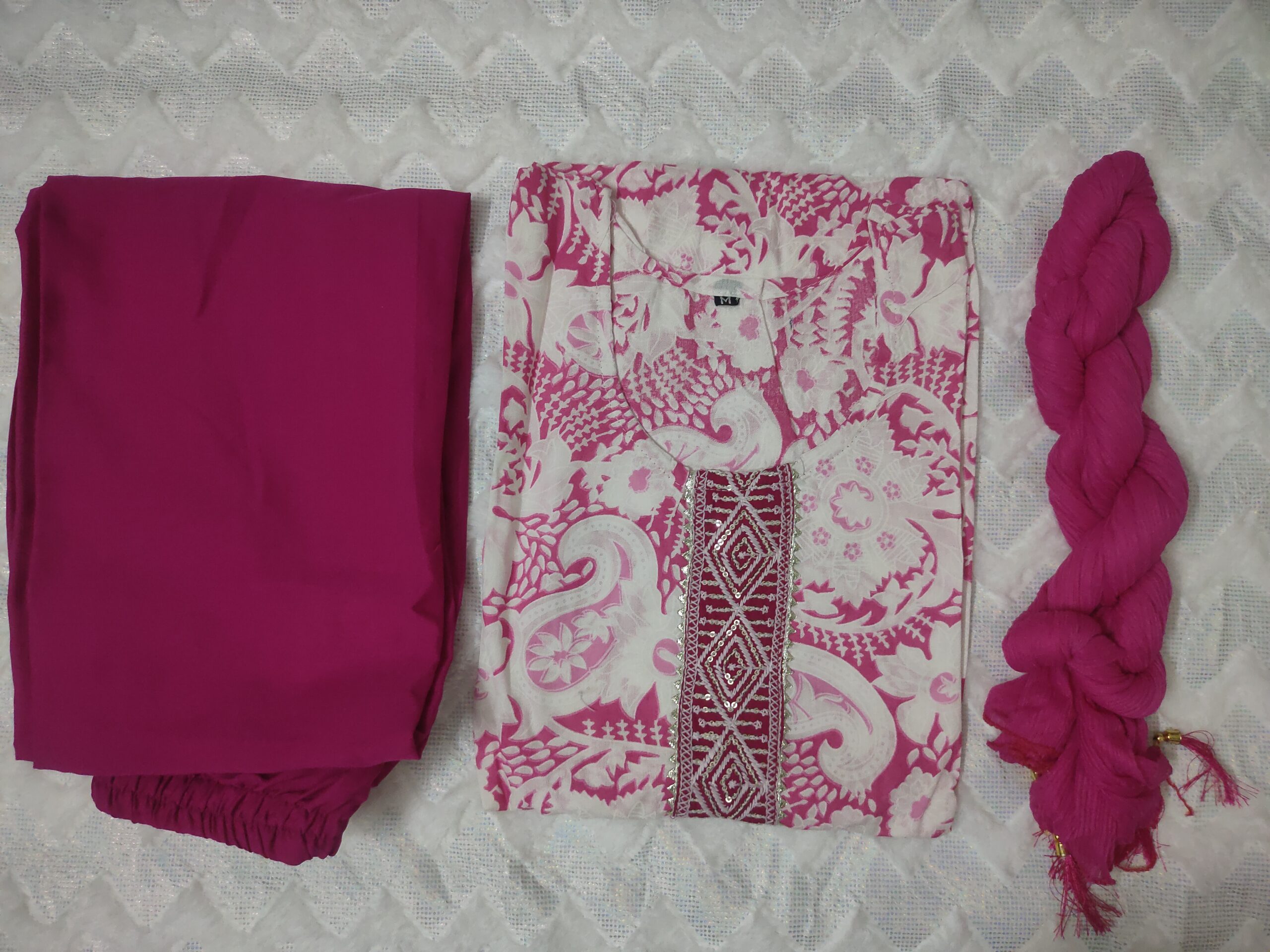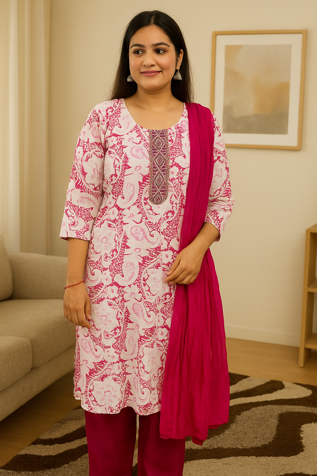 Add a touch of freshness to your ethnic wear with this pink and white printed kurta set. Featuring a straight-cut silhouette, intricate printed motifs, and a contrast embroidered neckline, this outfit blends comfort with elegance. Paired with solid pants and a vibrant pink dupatta, it’s perfect for casual outings, festive gatherings, or office wear with a traditional twist.
