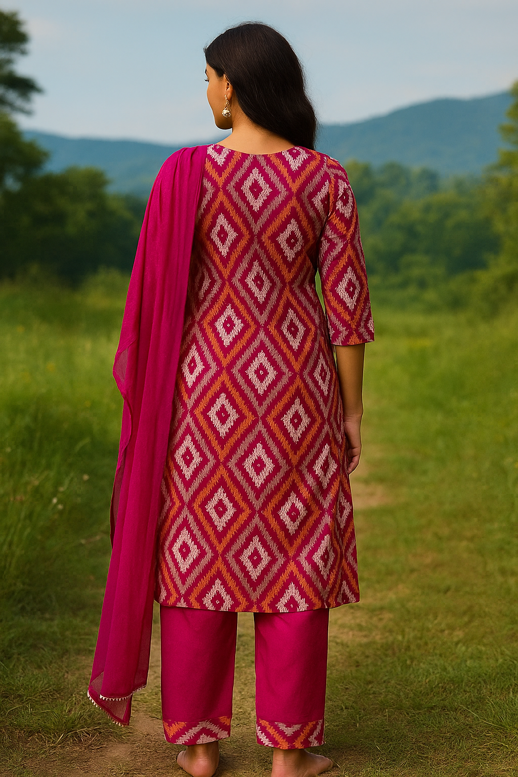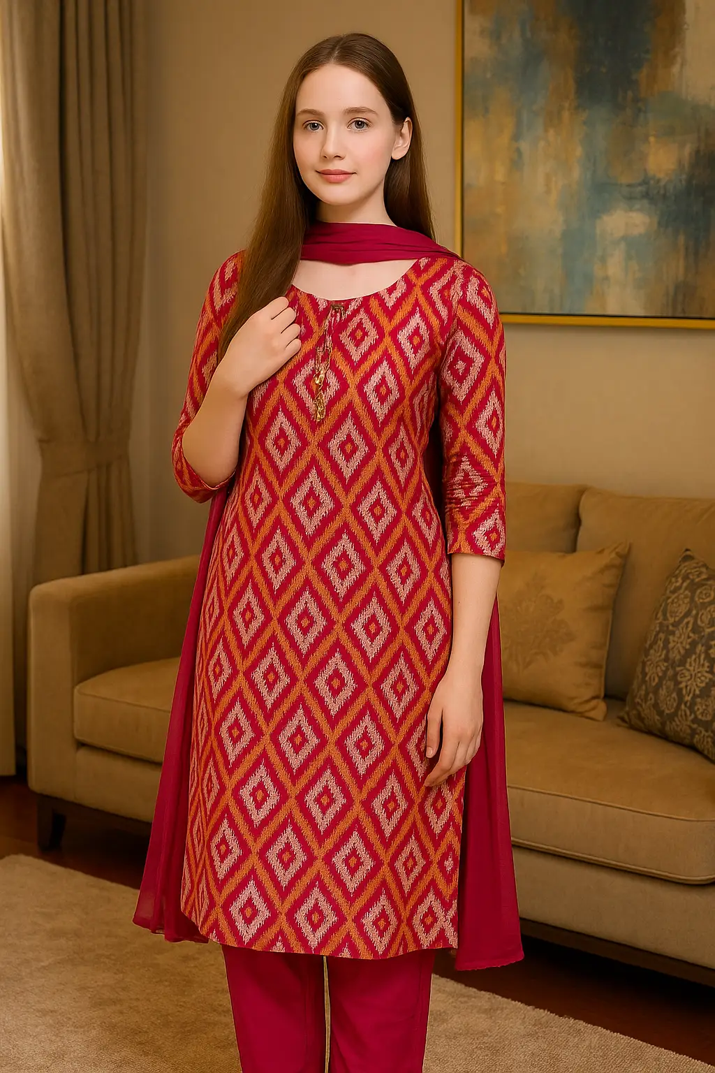 Elevate your ethnic style with our Ruby Ikat Elegance Kurti Set, crafted for timeless sophistication and everyday comfort. Designed in a rich ruby red shade with eye-catching geometric Ikat-inspired patterns, this kurti exudes charm and grace. The three-quarter sleeves and straight cut silhouette add a touch of modern simplicity, while the matching pants and lightweight dupatta complete the look with finesse.