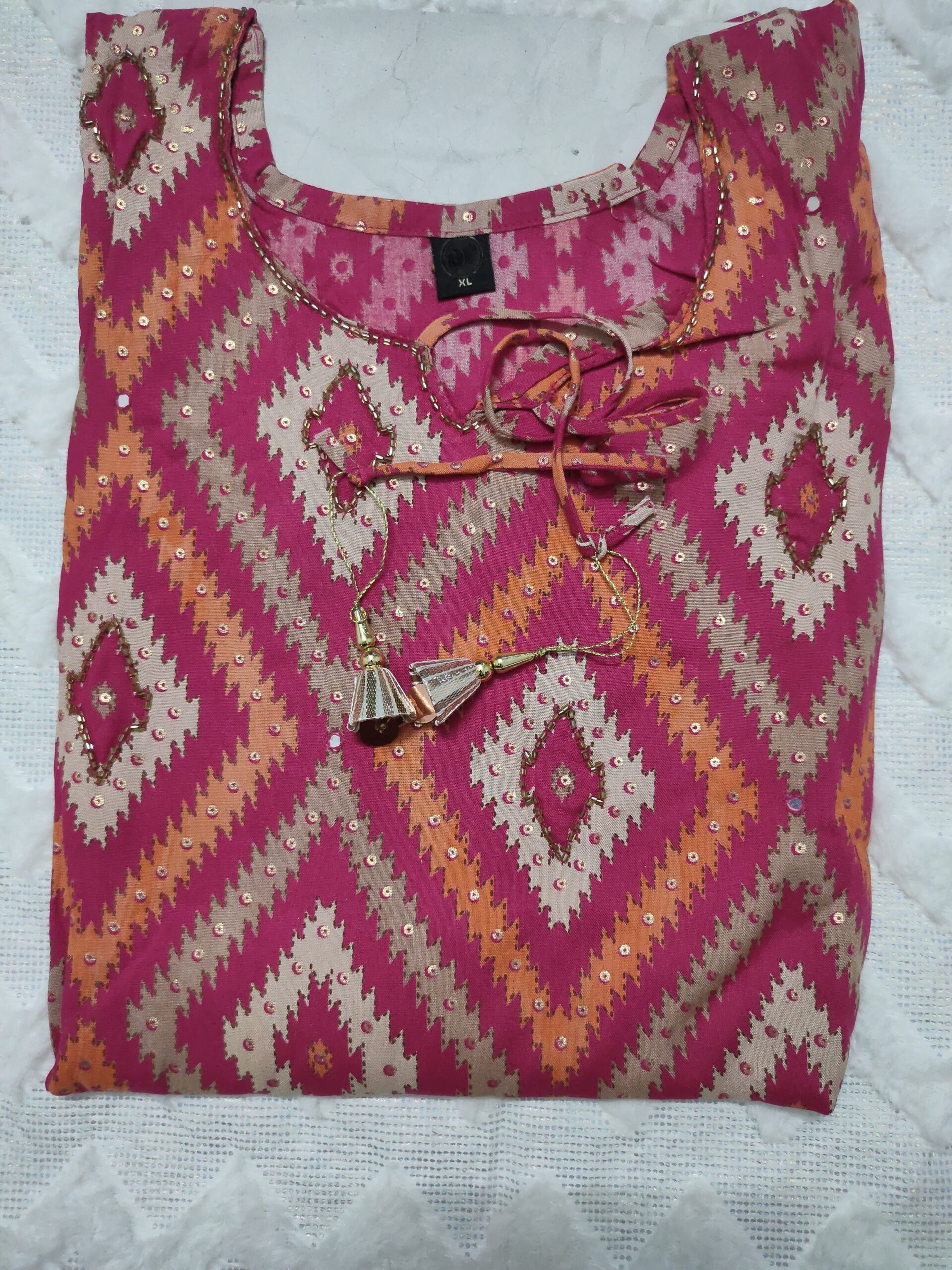 • Neckline: Round with keyhole & tassel detail